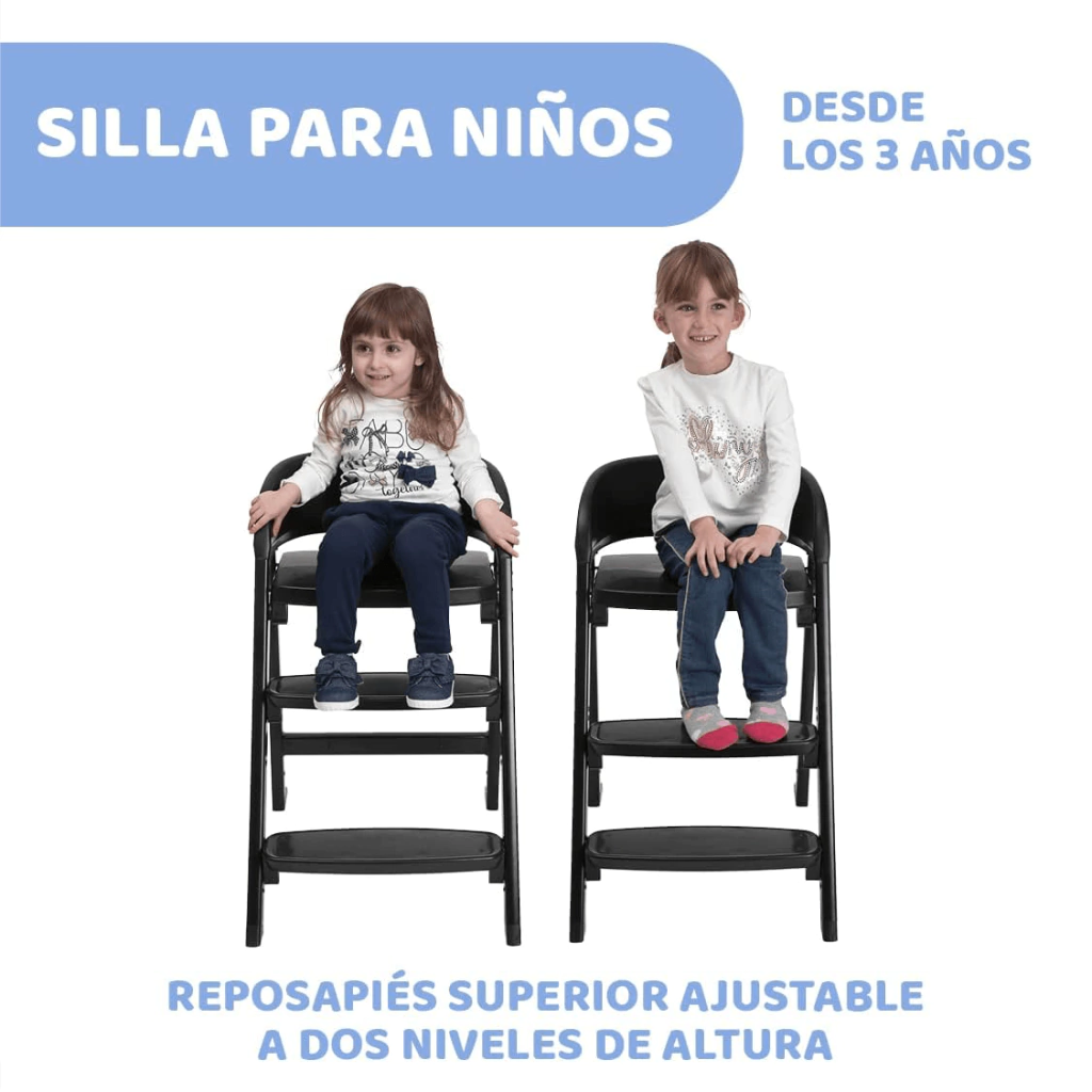 Reposapiés ajustables: el reposapiés más alto se puede ajustar a 2 alturas diferentes para adaptarse al crecimiento del niño y así poder subir y bajar de la silla con total autonomía, fomentando su independencia
