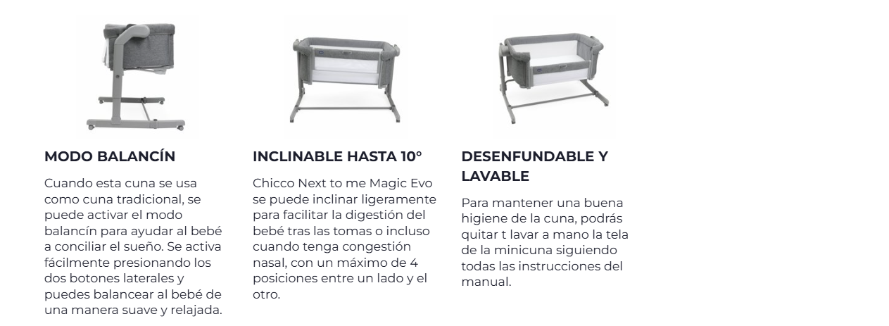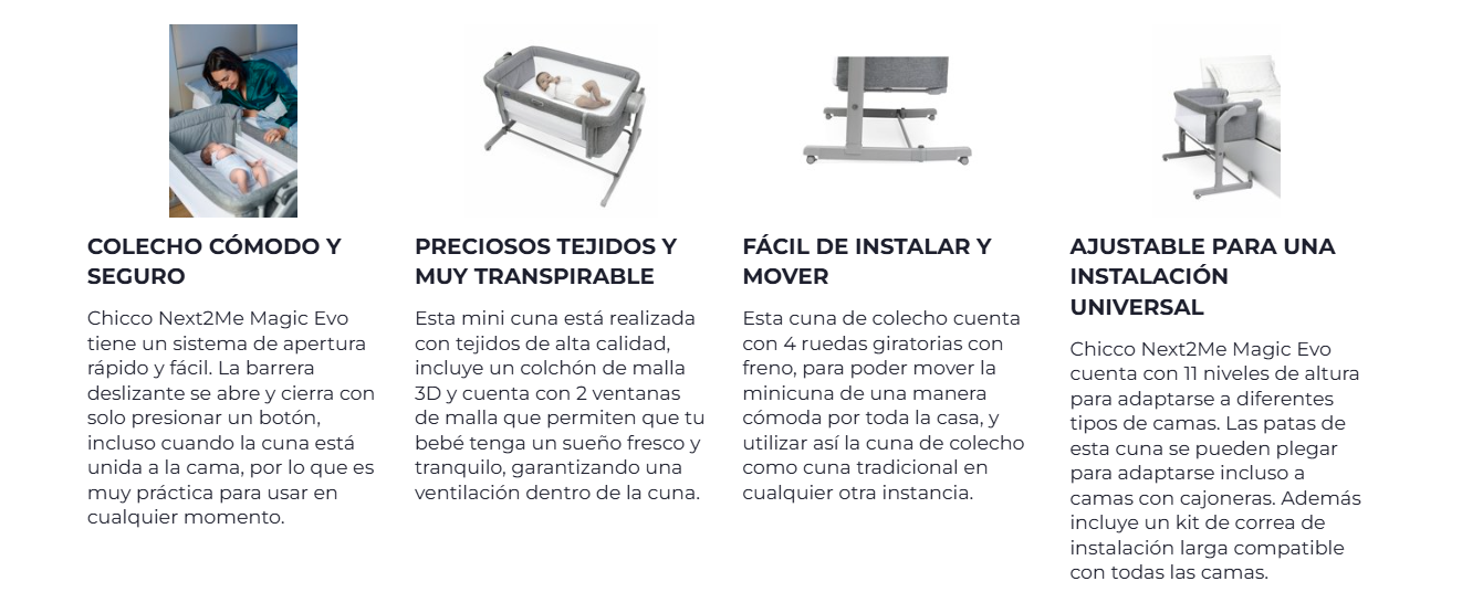 La Chicco Next2Me Magic Evo está pensada para que disfrutes cada noche con tu bebé desde el nacimiento hasta los 6 meses, ofreciéndote cercanía, comodidad y seguridad en un diseño práctico y versátil.